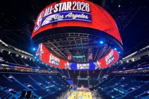 体育资讯02月13日讯 洛杉矶记者Arash Markazi晒照,快船主场直觉穹顶球馆全明星氛围已经起来了。